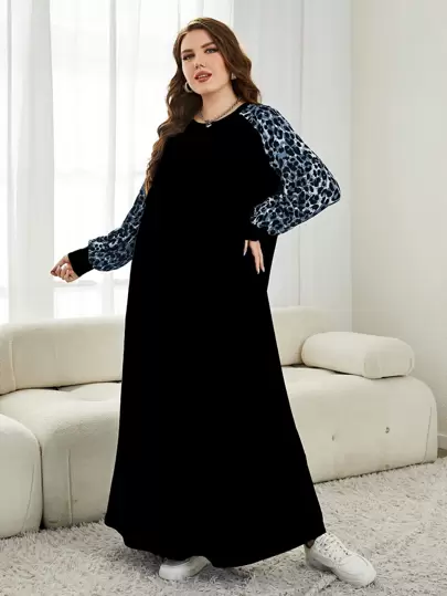 Lacomfia 大碼豹紋插肩袖T恤連衣裙 - 黑色 - 查看 1