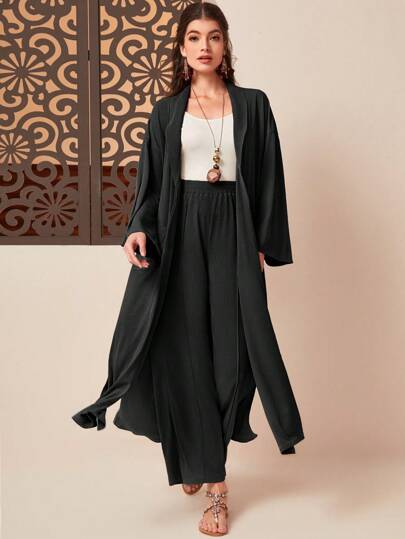 Seusyu 素色開門襟外套&闊腿褲 - 黑色 - 查看 1