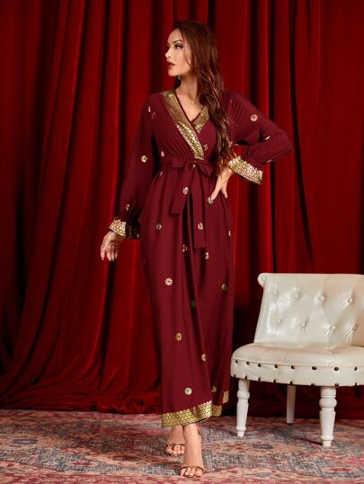 Al Najma 閃光花卉前交叉腰帶超長連衣裙 - 酒紅色 - 查看 1