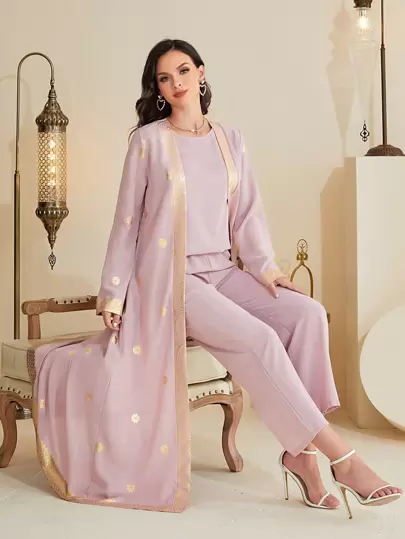 Al Najma 燙金花朵印花開門襟阿拉伯罩袍和褲子和襯衫 - 粉色 - 查看 1