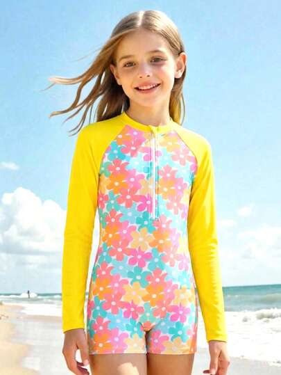 SHEIN 新款时尚女童(大码)粉色碎花连体泳衣,休闲优雅奢华,针织面料,拉链设计方便穿脱,适合海滩、度假、海边游泳,是夏季游泳的完美之选