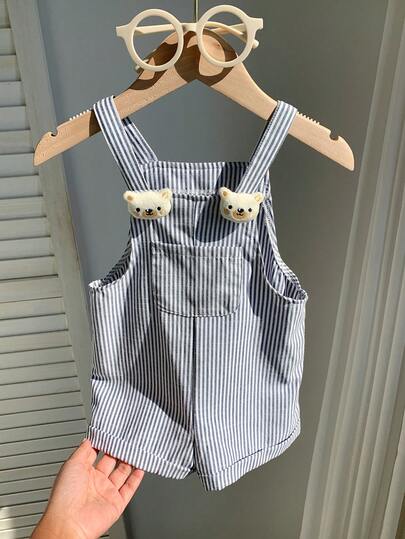 SHEIN 新生男宝宝可爱夏季假日条纹卡通3D小熊背带连体衣 - 彩色 - 查看 1