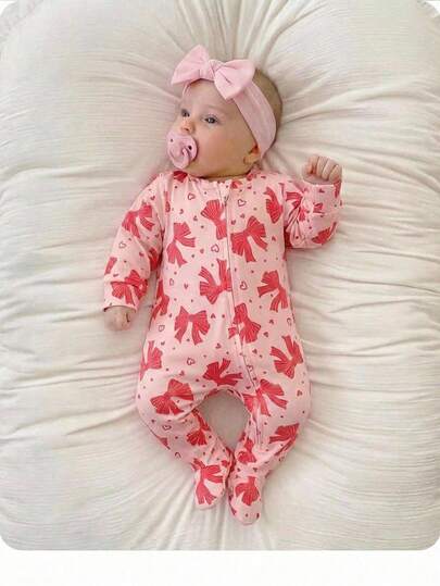 SHEIN 新生儿蝴蝶印花连体睡衣 - 粉色 - 查看 1