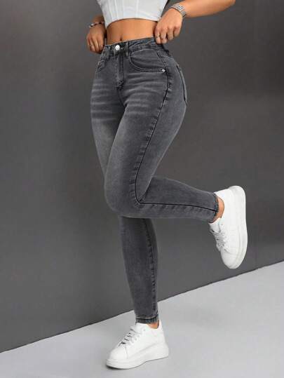 SHEIN PETITE 休闲破洞修身牛仔裤 - 深灰色 - 查看 1