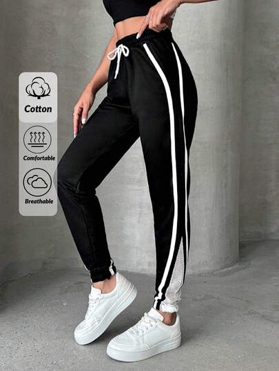 EURMUSE 95%纯棉 棉质抽绳口袋 侧条纹 条纹运动裤 - 黑色 - 查看 1