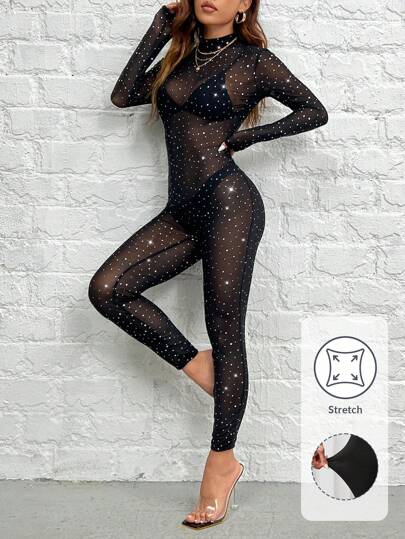 SHEIN PETITE 優雅性感黑色閃亮連身裝,鑲有鉆石細節網眼(內衣除外) - 黑色 - 查看 1