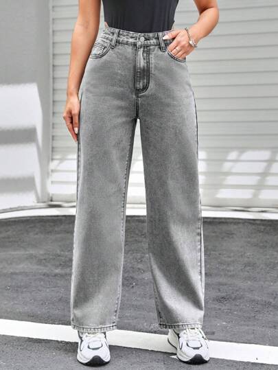 SHEIN PETITE 斜口袋直筒牛仔褲 - 灰色 - 查看 1