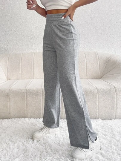 SHEIN PETITE 實色分立裾寬腿女褲,適用於春季 - 淺灰色 - 查看 1