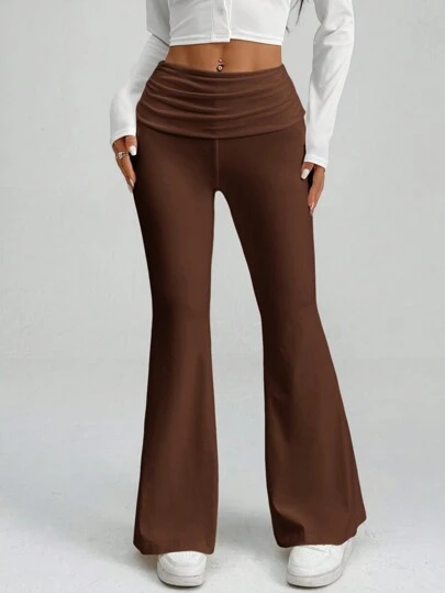 SHEIN PETITE 白色 Y2k 纯色褶皱喇叭裤 喇叭紧身裤 - 棕色 - 查看 6