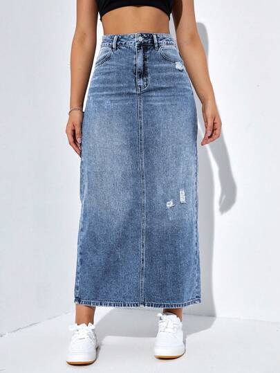 SHEIN PETITE 女士休闲时尚街头风高腰破洞牛仔迷你裙,适合日常通勤 - 藍色 - 查看 1