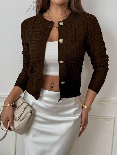 SHEIN PETITE 女士休闲长袖单排扣针织开衫,秋冬 - 咖啡棕 - 查看 4