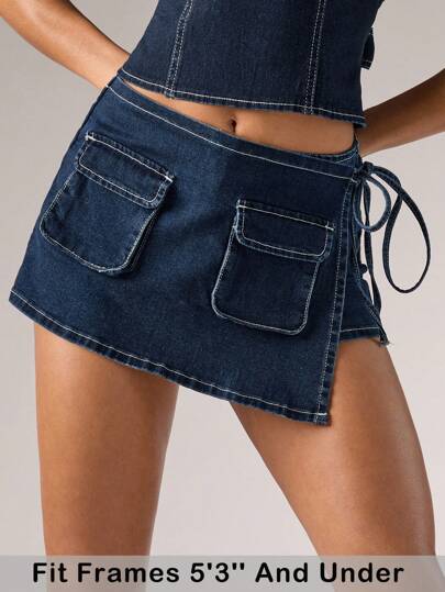 SHEIN PETITE 女式低腰牛仔裤,风琴口袋,蝴蝶结,Y2K 风格音乐节牛仔短裤 - 深色水洗藍 - 查看 1