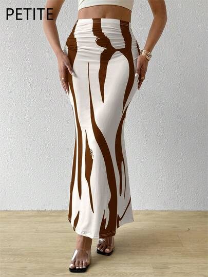 SHEIN PETITE 女士夏季抽象条纹印花褶皱鱼尾下摆度假棕色半身裙 - 咖啡棕 - 查看 1