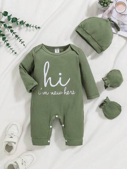 SHEIN Playful Pals 男婴字母印花罗纹圆领长袖连体衣,配同款帽子 - 軍綠色 - 查看 1