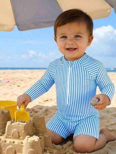 SHEIN Playful Pals 男婴泳衣,连体泳衣,拉链闭合,数码针织条纹印花。夏季海滩度假必备时尚单品。这款长袖短裤泳衣非常适合夏季穿着,是度假的理想之选,也适合可爱的小男孩在海滩玩耍和度假时穿着。