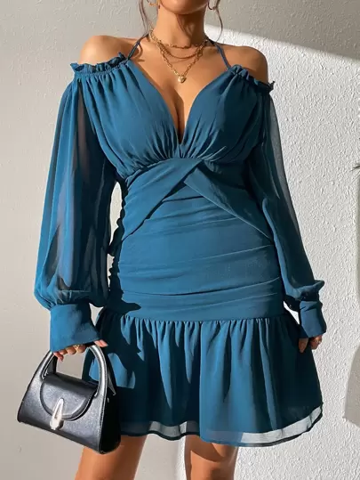 SHEIN Privé 挖肩前扭結褶邊褶邊荷葉邊連衣裙 - 水鴨藍 - 查看 1
