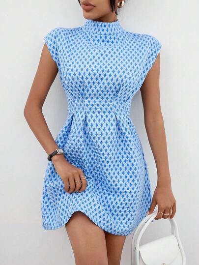 SHEIN Privé 小高領拼接細節連衣裙 - 藍色 - 查看 1