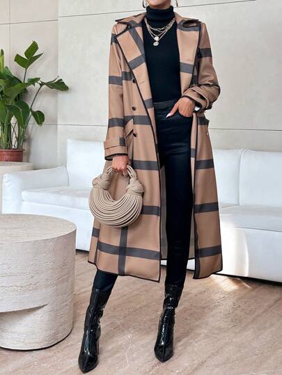 SHEIN Privé 格紋印花西裝領雙排釦腰帶外套 - 棕色 - 查看 1