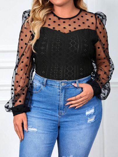 SHEIN Privé 大碼拼接波點網紗泡泡袖網眼刺繡上衣 - 黑色 - 查看 1