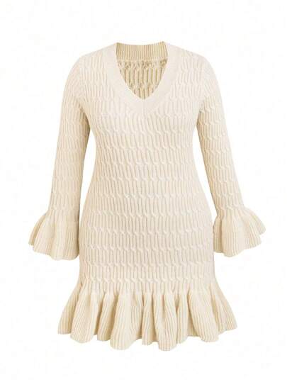 SHEIN Unity 大碼荷葉袖荷葉邊毛衣洋裝 - 杏色 - 查看 1