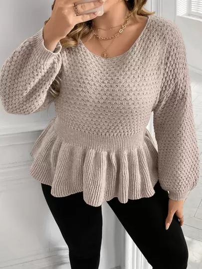SHEIN Unity 加长灯笼袖荷叶边毛衣,适合冬季和秋季穿着的针织套头衫 - 杏色 - 查看 6