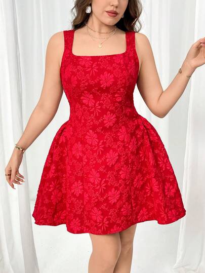 SHEIN Privé 大码春夏舒适优雅新年春节除夕约会晚会纯红色荷叶边迷你 A 字腰收腰性感褶皱下摆无袖细肩带连衣裙女士情人节 - 紅色 - 查看 1