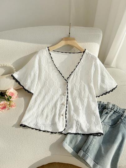 SHEIN Privé 大码女式刺绣V领短袖单排扣衬衫,夏季 - 白色 - 查看 1