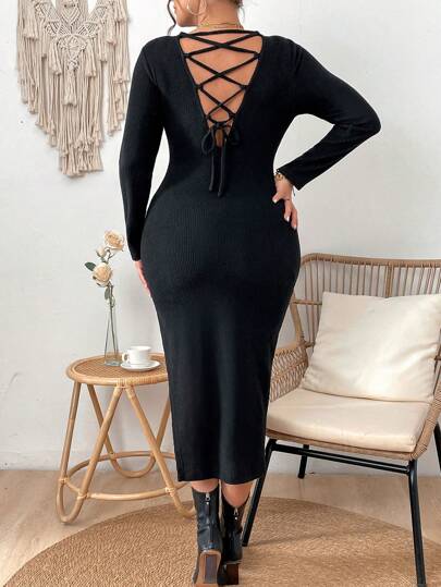 Celure 大碼女式後背十字帶細節修身連身裙 - 黑色 - 查看 1