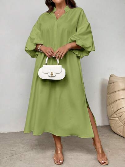 SHEIN Privé 大码女式优雅度假海滩浪漫约会婚礼派对立领灯笼袖中长宽松连衣裙,适合夏季 - 綠色 - 查看 1