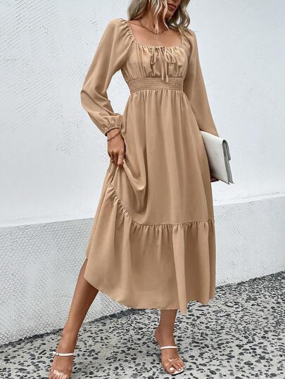 SHEIN Privé 休閒荷葉邊 前綁帶蝴蝶結 胸部褶皺純色女士連衣裙 - 杏色 - 查看 1