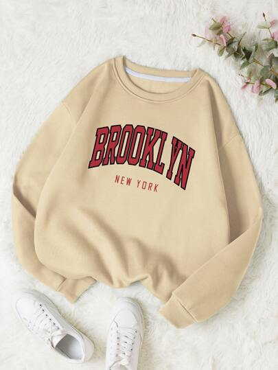SHEIN Qutie 字母圖案加絨內裏運動衫 - 杏色 - 查看 1