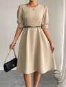 Rafferiza 女式方领泡泡袖纹理法式度假荷叶边下摆连衣裙,优雅奶油黄色