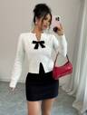 Rafferiza 法式复古优雅休闲简约通勤商务休闲女装秋冬女装黑白撞色白色小翻领衬衫领小喇叭袖撞色条纹A字喇叭裙收腰短款长袖度假风女装毛衣连衣裙