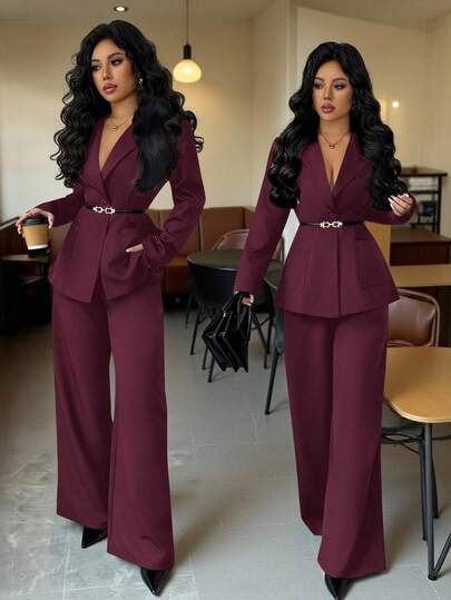 SHEIN Raffinéa 女士纯色西装套装,时尚通勤女装套装,女士两件套,正式女装套装,商务女装两件套,女士服装套装,商务休闲女装两件套,女士两件套套装,正式舞会女装套装,女士套装,商务女装裤装