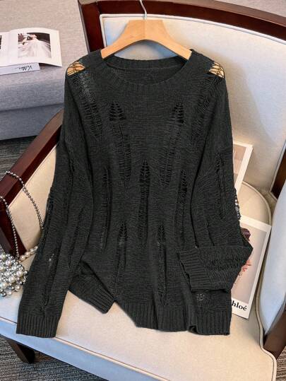 Calvaya 大码休闲破洞宽松针织毛衣,圆领,秋冬 - 黑色 - 查看 1