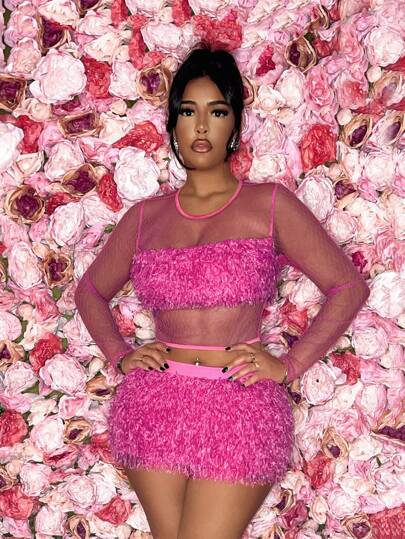 SHEIN SXY 性感網紗和羽毛長袖兩件裝連衣裙,適合舞會派對 - 粉色 - 查看 1