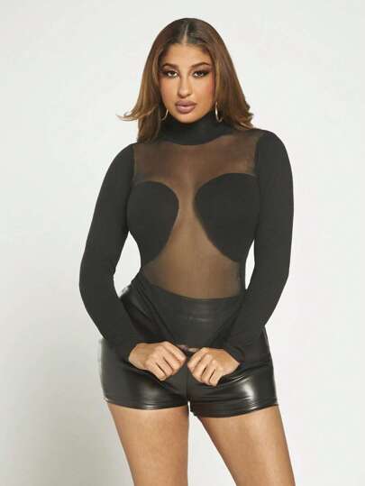 SHEIN SXY 高領拼接網紗套頭毛衣 - 黑色 - 查看 1