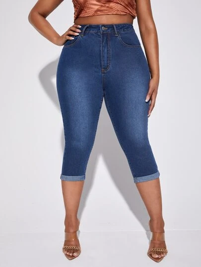 SHEIN SXY 大碼高腰卷邊緊身牛仔褲 - 深色水洗藍 - 查看 1