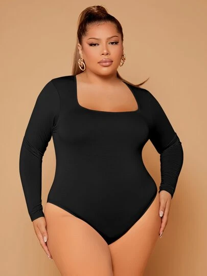 SHEIN SXY 大碼方領修身連體衣 - 黑色 - 查看 1