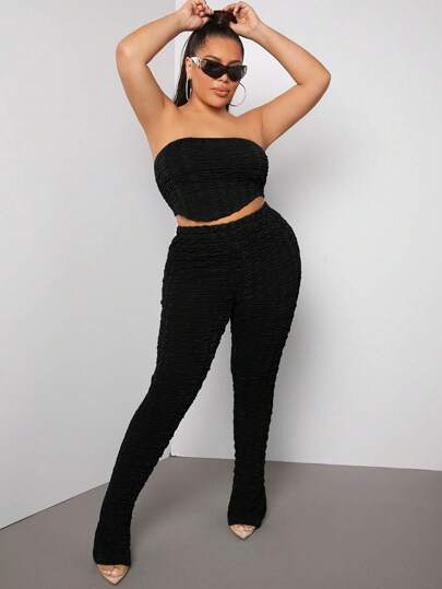 SHEIN SXY 大碼紋理質感抹胸上衣和褲子 - 黑色 - 查看 1
