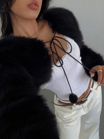 SHEIN SXY 性感可爱白色圣诞仿皮草披肩外套,秋冬时尚黑白上衣优雅休闲皮草上衣女士冬季仿皮草外套 - 黑色 - 查看 5