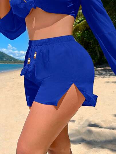 SHEIN SXY 素色下擺開叉短褲 - 寶藍色 - 查看 1