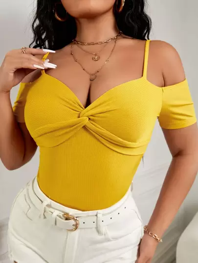 SHEIN SXY 前扭結挖肩T恤 - 黃色 - 查看 1