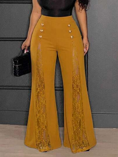 Slaydiva 春夏新款女装,秋冬新款女装,音乐节万圣节新款服装,女士生日礼服,日常穿着,百搭单品,休闲装,度假装,邮轮旅行装,沙滩装,日光浴装,热门单品,黑色蕾丝拼接镂空夜店装,性感宽松阔腿裤,大码黄色长裤,黄色阔腿裤,蕾丝拼接裤