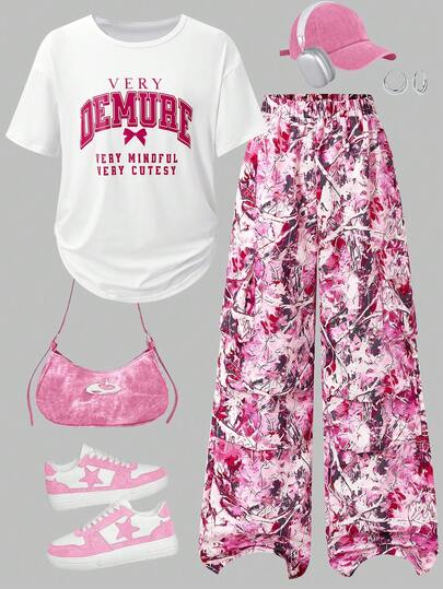 SHEIN Sparklyn 两件套少女字母印花短袖T恤和长裤 - 彩色 - 查看 1