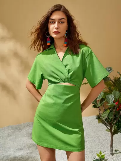 SHEIN 交疊領後綁帶鏤空連衣裙 - 青檸色 - 查看 1