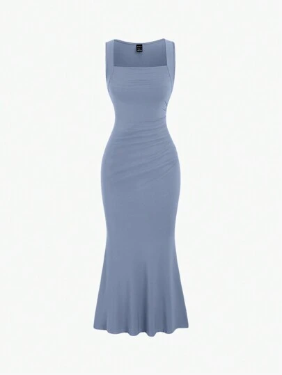 SHEIN Sweetro 夏季优雅纯色方领褶皱高腰美人鱼无袖连衣裙长款女装