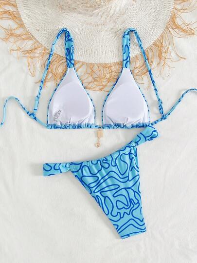 SHEIN Swim 2 件套 Springbreak 简约印花随机设计 Bralette 比基尼上衣和可调节腰部三角裤 - 彩色 - 查看 1