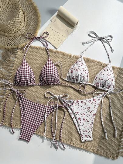 SHEIN Swim Mod 两件套女士挂脖系带碎花比基尼泳衣,简约时尚海滩度假风