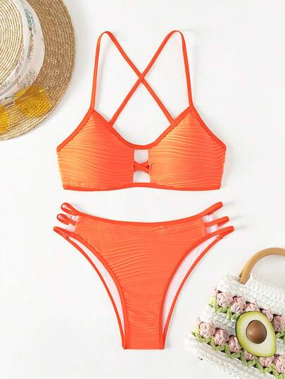SHEIN Swim 纯色纹理细肩带比基尼套装 适合海滩度假 夏季 - 橘色 - 查看 1